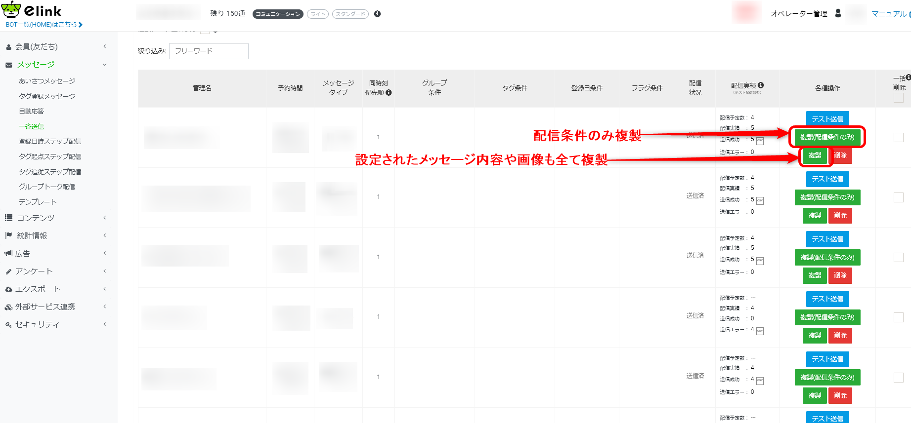一斉送信の複製は、配信条件のみの複製と、設定されたメッセージ内容や画像も全て複製する複製と2種類ございます。